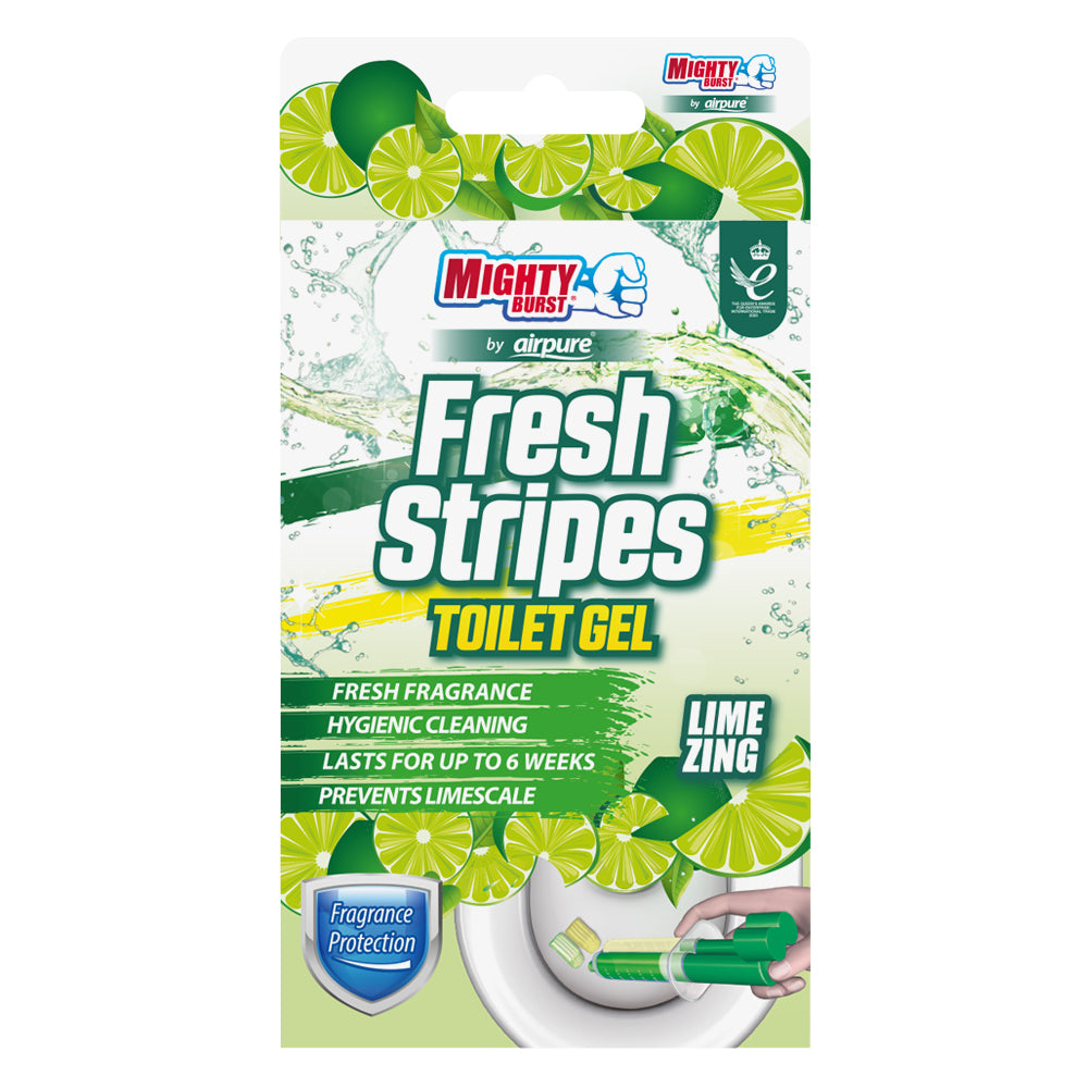 Fresh Stripes Toilet Gel freshens up your toilet for up to six weeks. Each box is equipped with a syringe-like applicator, which allows you to squeeze out the cleaning gel into the toilet into a perfectly satisfying stripe.  Each stripe will last for up to a week and the handy applicator shows you how much to apply week-by-week.
